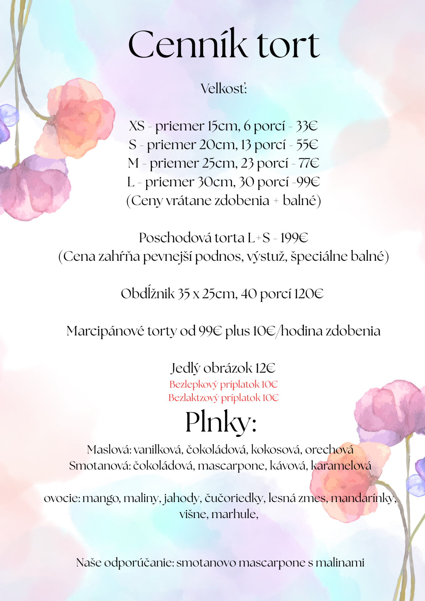 objednávky minimálne 2 týždne vopred 12% zľava (platí pre torty aj zákusky)